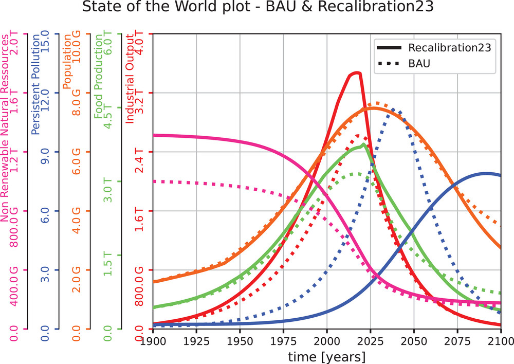 According to Gaya Herrington’s analysis, this scenario indicates economic and industrial growth stopping and then declining, which would “hurt food production and standards of living”. (Gaya Herrington, ‘Update to limits to growth‘ 2020)4