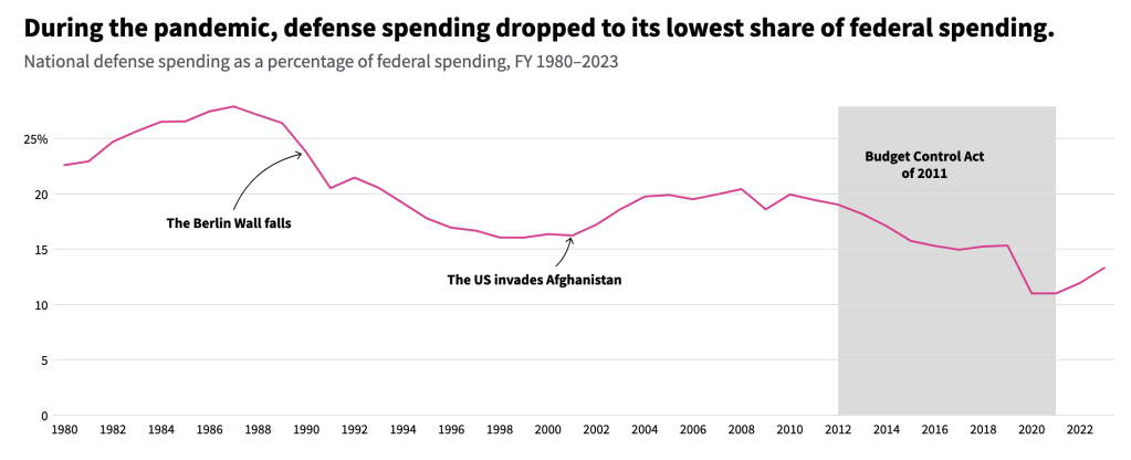 US military spending has increased more than 48% in real (inflation-adjusted) terms in the first 24 years of this century. This growth has occurred despite the end of the Iraq War and the withdrawal from Afghanistan.