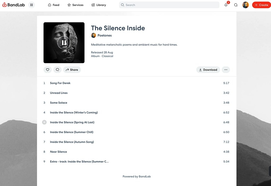 I also tried my hand at an AI generated album ‘The Silence Inside‘: a mixture of some of my poetry and instrumental music all using similar prompts to give the whole thing a (hopefully) coherent sound. Unfortunately AI can not yet produce studio quality tracks.