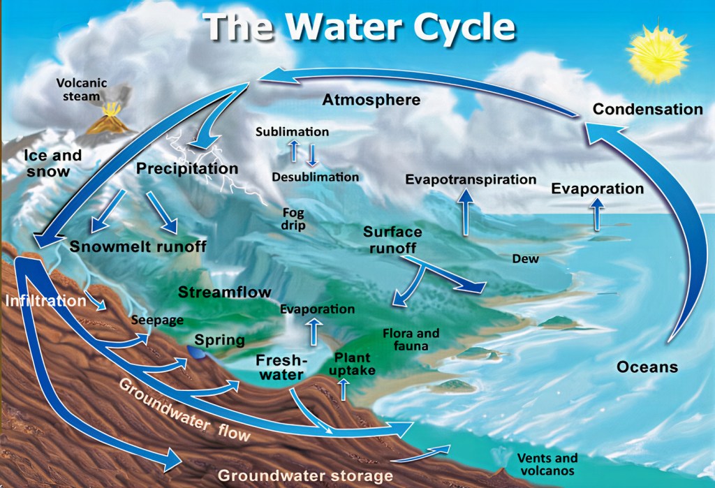 For the purposes of water and other matter, the Earth largely acts as a closed system (exchanges with the surrounding space are primarily energy exchanges) and so the process can give rise to a recycling of water and the molecules can take up a new higher-energy (lower-entropy) configuration and start the process again. The water cycle process is not truly reversible (i.e., it is not the same water molecules spontaneously flowing from the sea up to the mountains and then into the sky), yet the power of the Sun gives us something very close to reversibility in practice: the natural water cycle. The additional energy required to move the water back up (e.g., from the ocean, sea or lake) to the higher altitude point to restart the flow is a product of the Sun’s continuous supply of free useful energy.