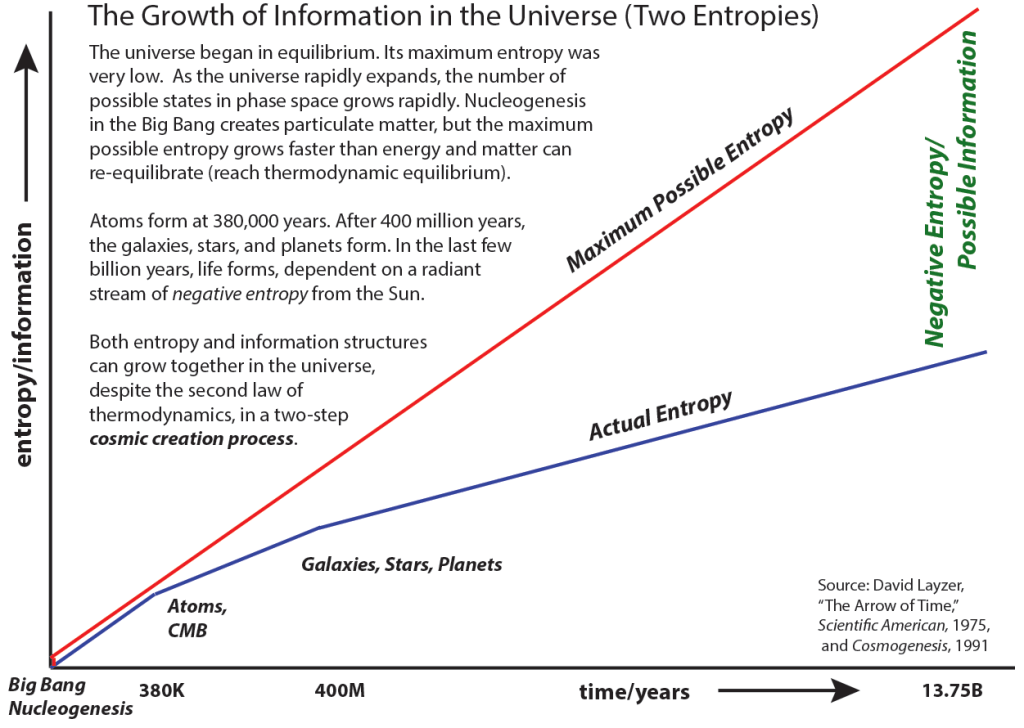 “David Layzer … made it clear that in an expanding universe the entropy would increase, as required by the second law of thermodynamics, but that the maximum possible entropy of the universe might increase faster than the actual entropy increase. This would leave room for an increase of order or information at the same time the entropy is increasing!”36