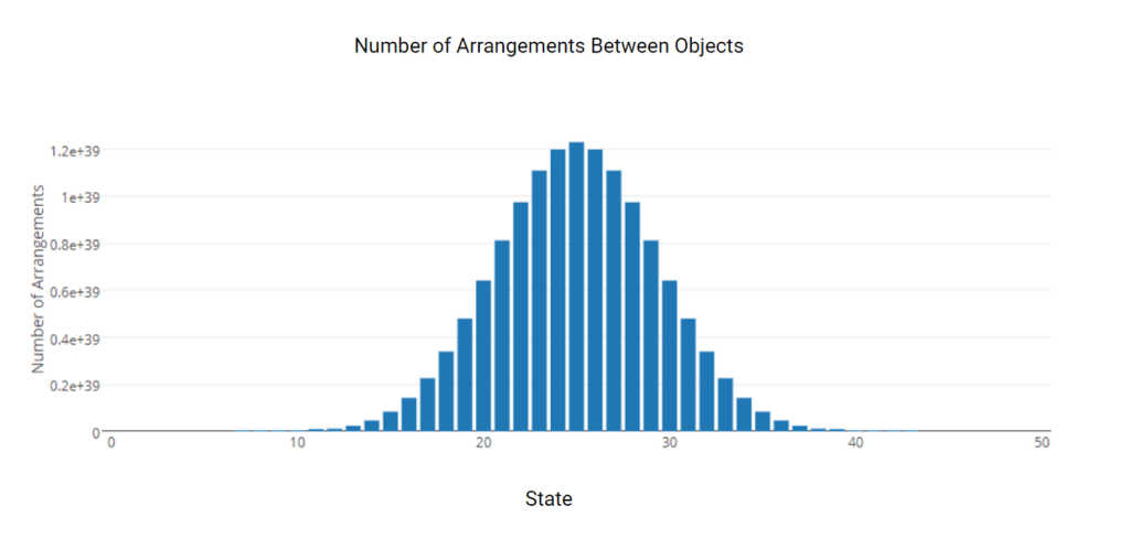 “This histogram illustrates an important principle: As you add more states to your system, it becomes more likely that the arrangement you observe is the most likely arrangement. For example with just 50 states, the odds of observing the least likely arrangement is 1 in 132,931,168,175. Now imagine the sand castle has hundreds of millions23of grains of sand.”24