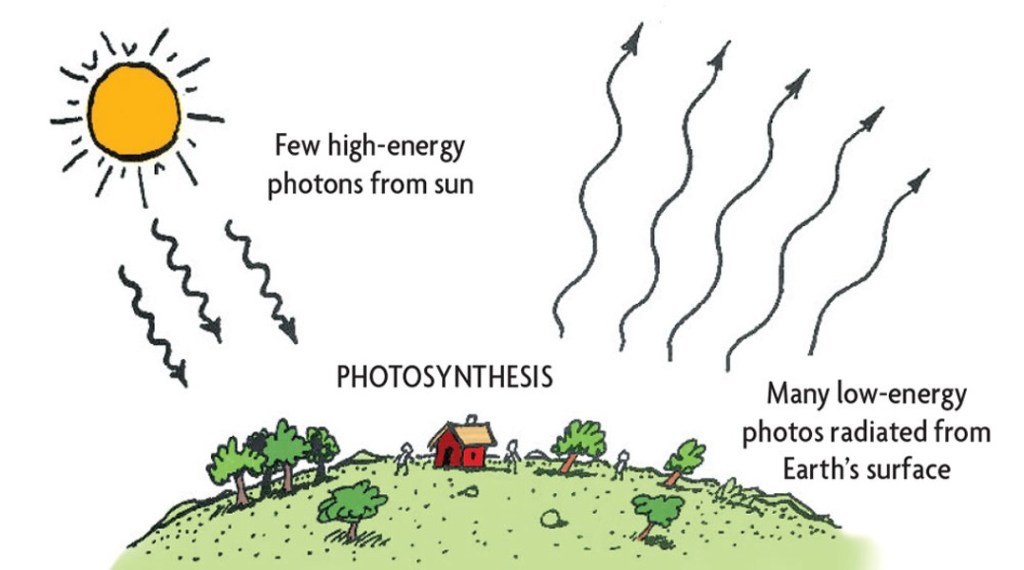 In the case of the Earth, we are told that this life process involves all life-forms (and all matter within the biosphere used to build living organisms) taking in energy from the sun at a higher frequency and releasing the same amount of energy back into the environment and the universe at a lower frequency.